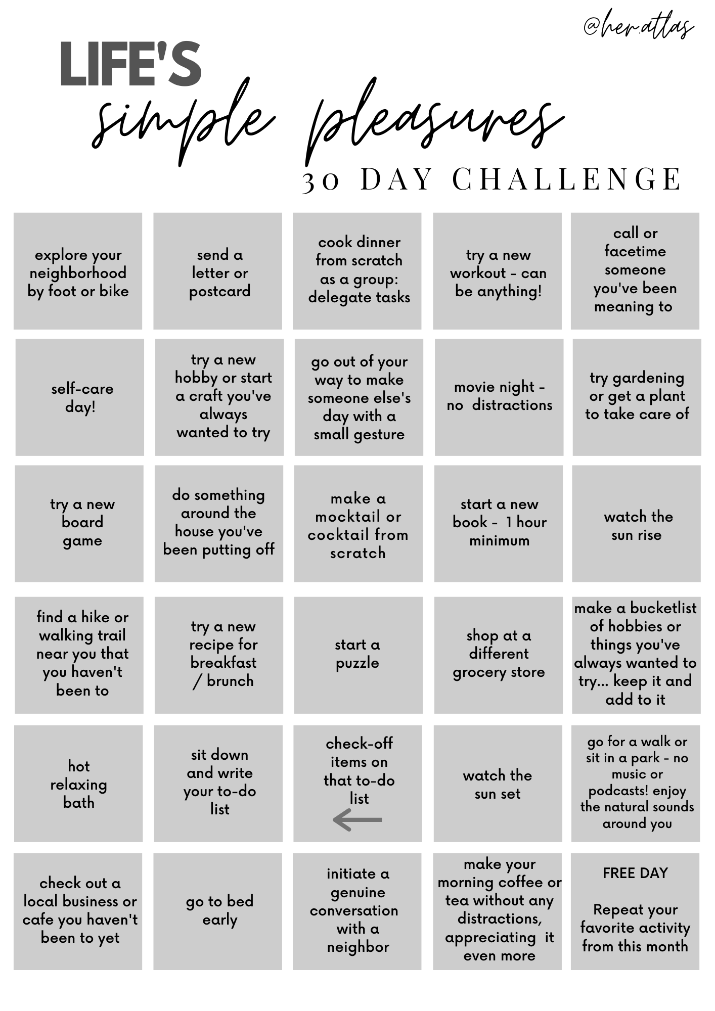 Majority of the time the greatest and simple pleasures you dont need to spend a dime. Pleasure is always the last thing on our to-do list.